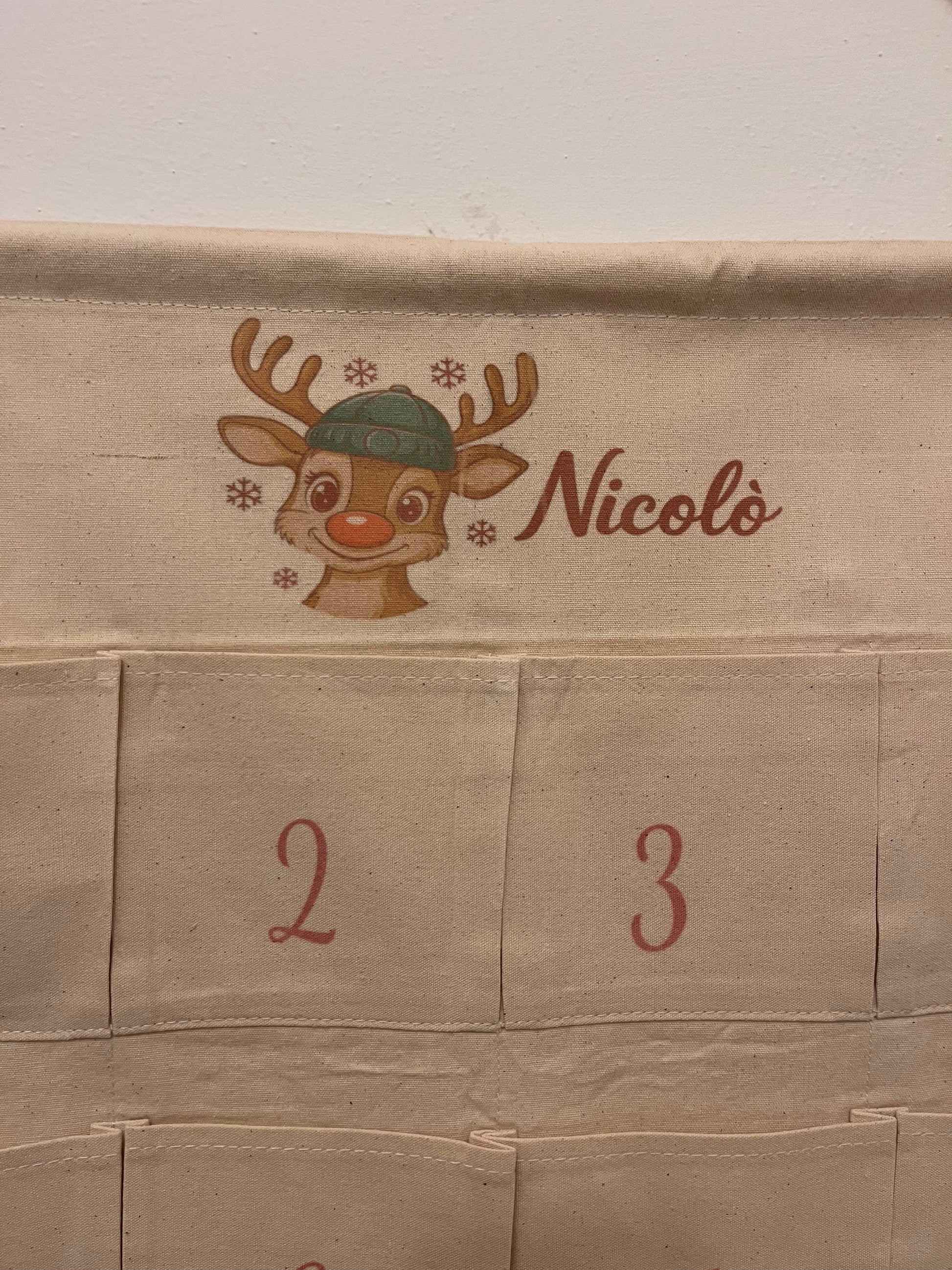 Il dolce disegno natalizio e la stampa del nome rendono questo calendario un ricordo unico e riutilizzabile ogni anno, perfetto per decorare la cameretta o il soggiorno con uno stile caldo e artigianale.