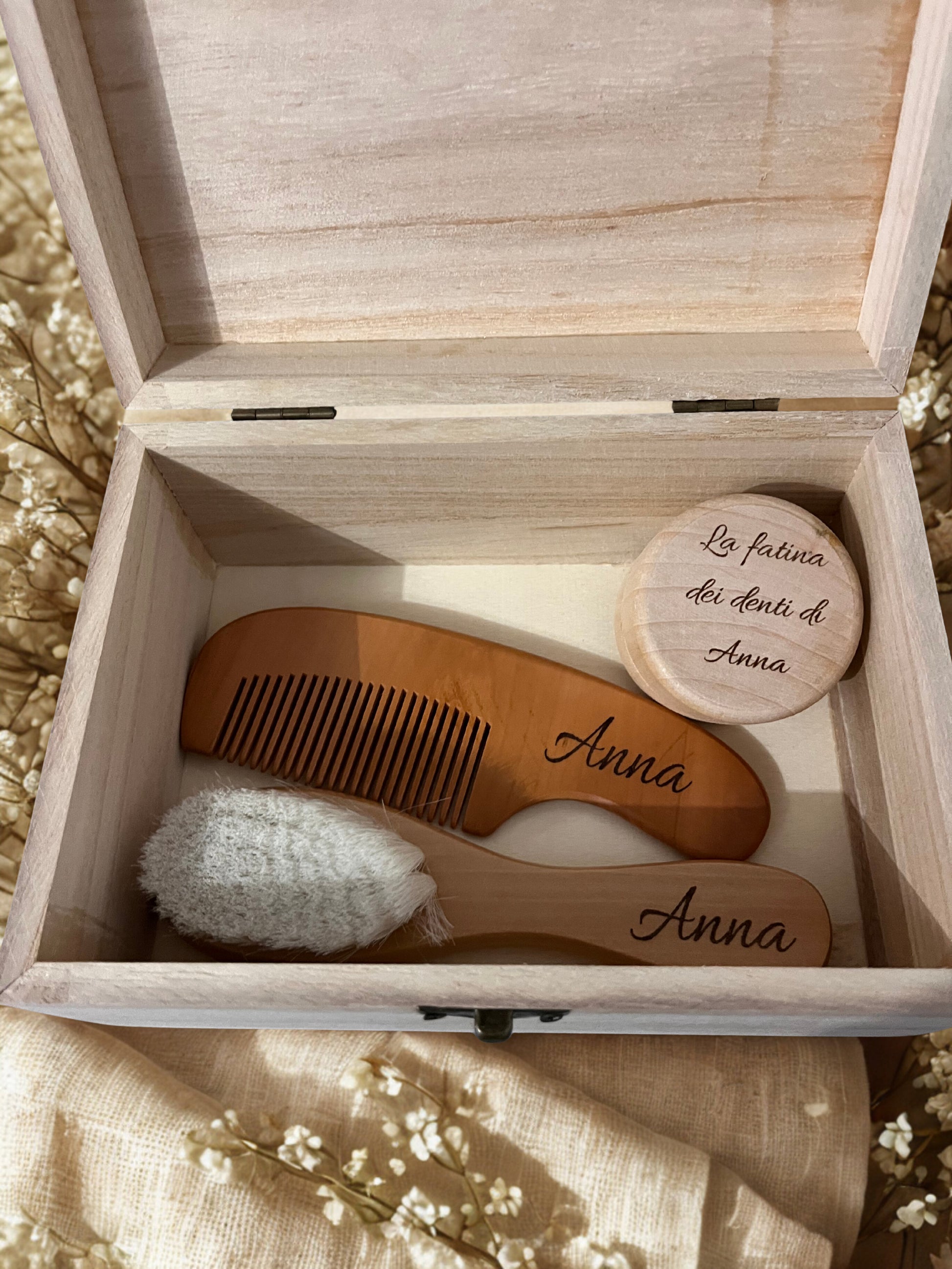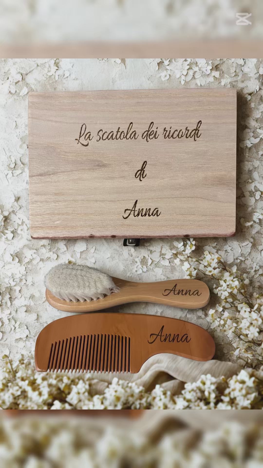 All’interno troverai un set composto da pettine e spazzola in legno, entrambi personalizzati con il nome del bambino. Ogni pezzo è inciso con cura, trasformando un semplice accessorio in un ricordo unico da custodire negli anni.